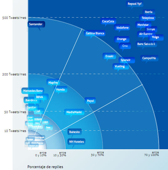 Mapa del posicionamiento de las 75 compañías analizadas en Twitter en base a su nivel de relación con los usuarios (Estudio To Tweet or Not To Tweet sobre la Presencia de las Marcas Españolas en Twitter para Atención al Cliente)
